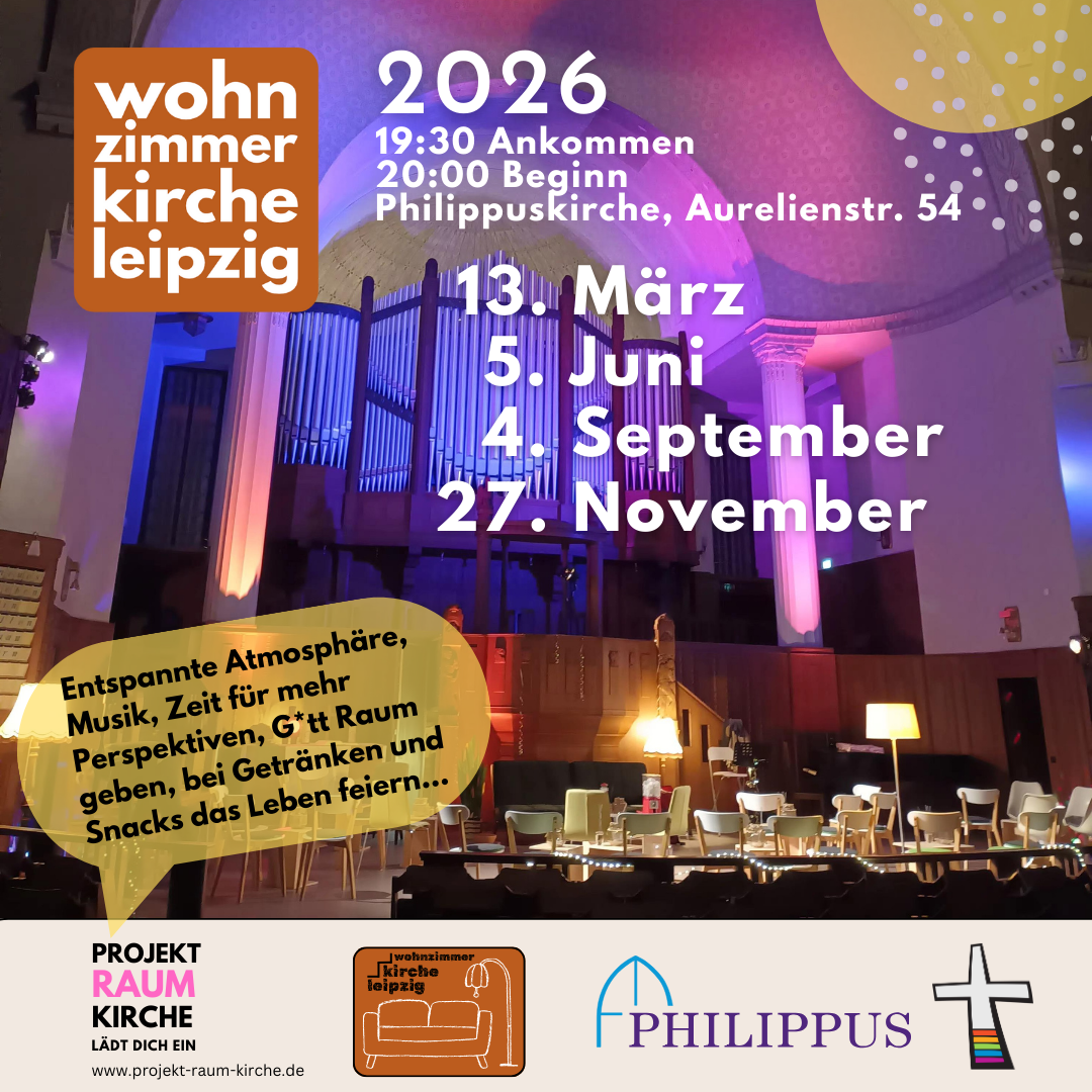 🛋️ Wohnzimmerkirche Freitag, 13. März 2026, Ankommen ab 19.30 Uhr, Start 20 UhrPhilippuskirche (Aurelienstraße 54) Wohnzimmerkirche Leipzig Entspannte Atmosphäre, Musik, Zeit für gute Gespräche, G*tt Raum geben, bei Getränken und Snacks das Leben feiern,...