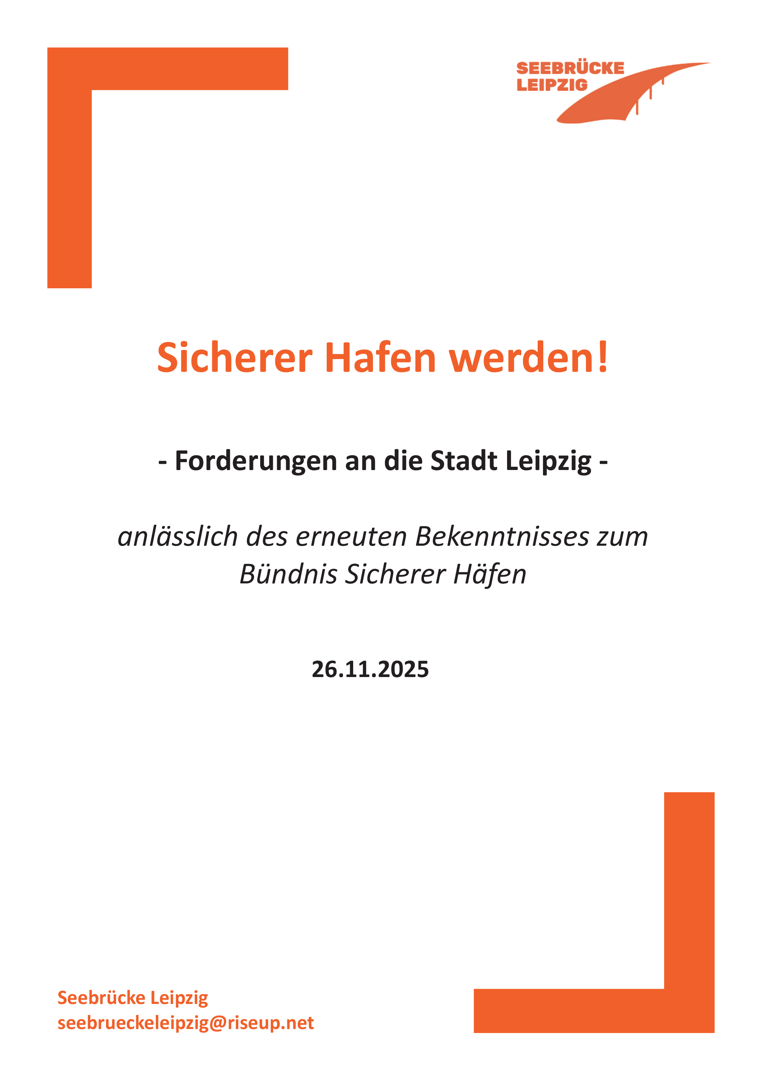 Die Ev.-Luth. Bethanienkirchgemeinde Leipzig-Schleußig unterstützt das Forderungspapier "Sicherer Hafen werden!" der Initiative Seebrücke Leipzig, mit dem die Stadt Leipzig aufgefordert wird, ihrem im Februar 2025 erneuerten Bekenntnis zur Mitgliedschaft im Bündnis Sicherer Häfen konkrete politische Maßnahmen folgen zu lassen.
