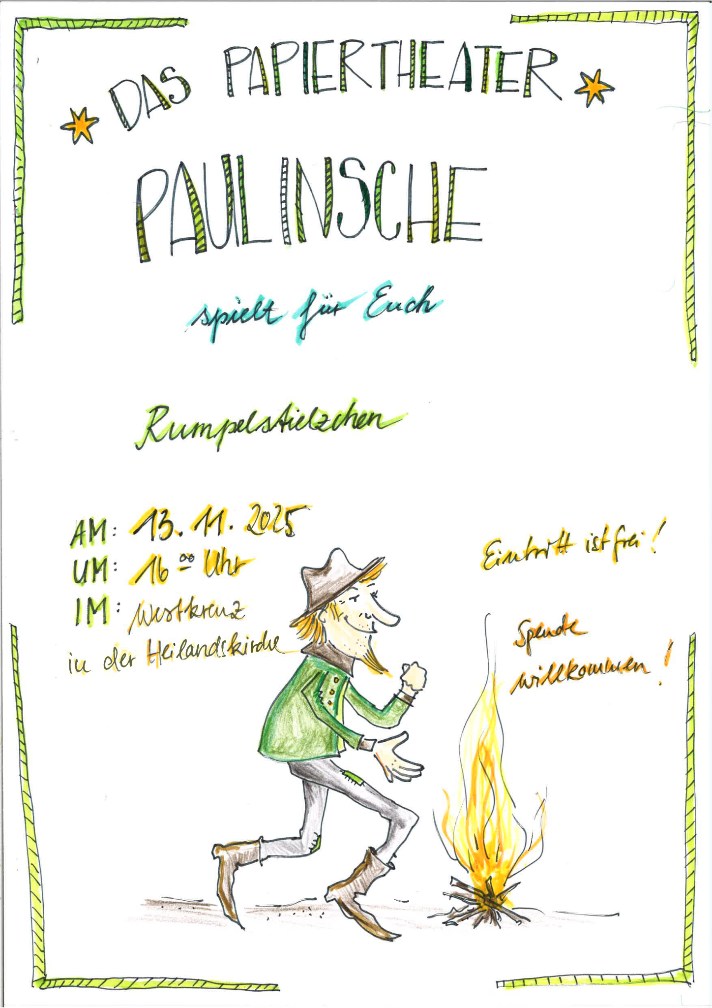 🎭 Papiertheater Donnerstag, 13. November 2025, 16 UhrWestkreuz (Weißenfelser Str. 16) Das Paulinsche Papiertheater spielt für Euch:Rumpelstielzchen Eintritt frei – Spende willkommen!