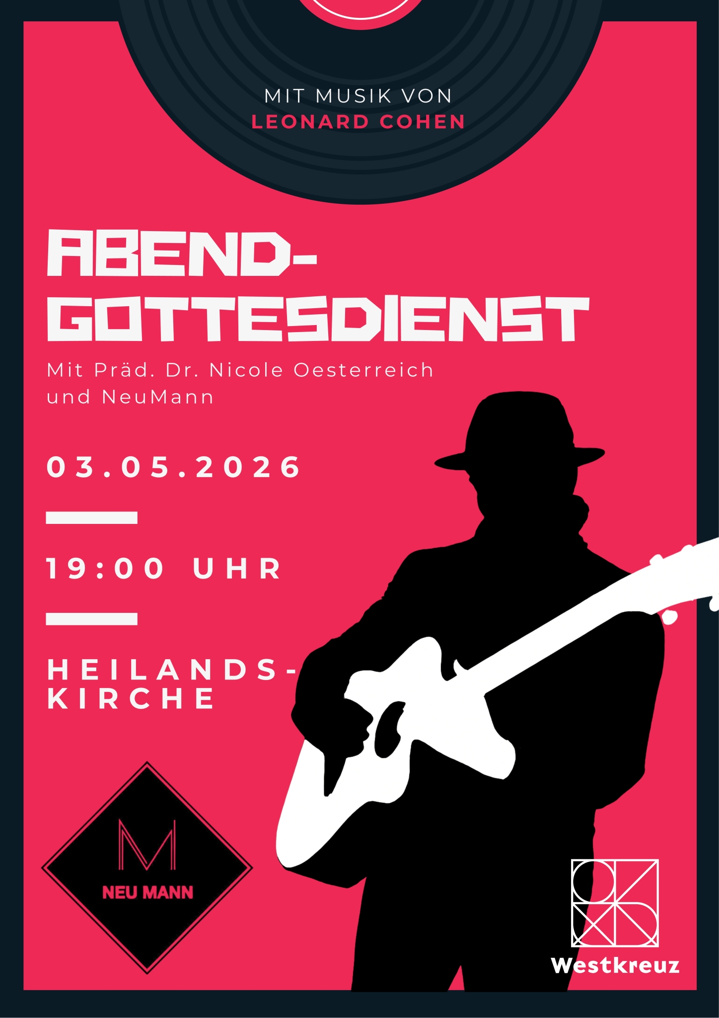 🎸 Abendgottesdienst Sonntag, 3. Mai 2026, 19 UhrWestkreuz/Heilandskirche (Weißenfelser Str. 16) Abendgottesdienstmit Musik von Leonard Cohen Mit Präd. Dr. Nicole Oesterreich und NeuMann